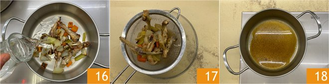 Transfer everything to a pot with a drizzle of oil, cover with cold water 16, and cook for 30 minutes. Strain through a sieve 17 and reduce the cooking broth by ¾ 18. This will give you a delicious rabbit jus.