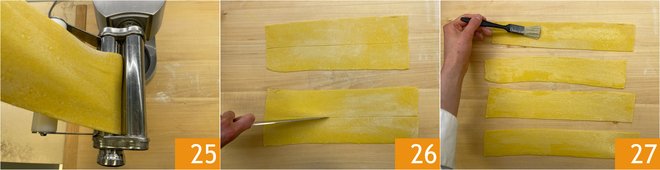 Meanwhile, take the dough from the fridge and roll it out with a pasta machine 25. Cut the sheets in half lengthwise 26. Brush the pappardelle with water 27.