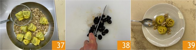 Drain the pappardelle and add them to the sauce 37, cook for 2-3 minutes, just enough time to flavor them. Meanwhile, finely chop the black olives by hand 38. Plate the pappardelle first, then the rabbit ragù 39.
