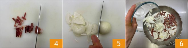 Meanwhile, cut the guanciale into strips 4 and the onion into slices 5. In a pan, add a drizzle of oil, then add the guanciale and onions 6. Sauté over low heat for a few minutes.