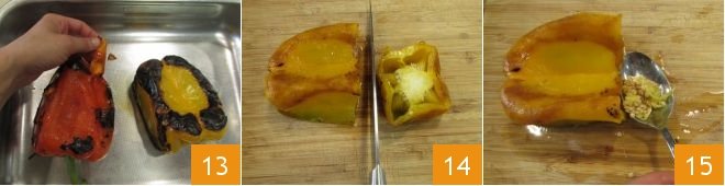 Meanwhile, retrieve the peppers and remove the outer skin, which will come off easily 13. Cut off the top 14 and remove the inner seeds 15.
