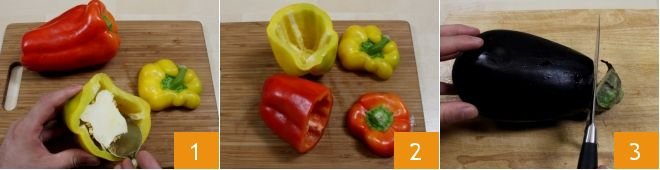 To prepare the stuffed peppers with ricotta, eggplants, and pine nuts, start by washing the peppers and eggplants well under running water. Then cut the top off the peppers (you can set it aside for garnish) and empty them of seeds using a spoon 1. Then trim the eggplant, removing the stem 1 and the bottom end with a knife.