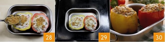 Then add it to the peppers 28. Now that the peppers are filled, you can place the baking dish on a baking tray 29 and bake them in a preheated static oven at 356°F (if using a fan oven, at 320°F) for at least an hour. After 45 minutes, check the level of cooking, which may vary depending on the size of the peppers. Once cooked, remove the peppers from the oven, let them rest for 5 minutes, and serve your stuffed peppers with ricotta, eggplants, and pine nuts while still hot or warm 30. For a more appealing presentation, you can also garnish them with their "lid"!