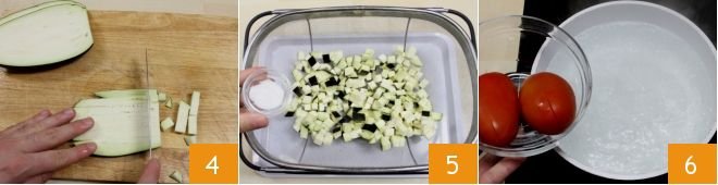 Slice the eggplant into slices about 1 cm (approximately 0.4 inches) thick and cut them into cubes 4. Transfer the cubes onto a colander placed over a tray to allow the eggplants to lose their bitter liquid; to facilitate this process, sprinkle them with salt 5 and let them rest for at least 20 minutes. Meanwhile, proceed to prepare the tomatoes: wash them and score the skin with a small knife by making a cross, making it easier to peel them after blanching. Place them in a pot where you have brought water to a boil 6.