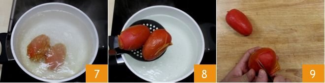 Boil them for a few moments 7, then drain them with a skimmer 8 and let them cool slightly. Gently remove the skin with a small knife 9.