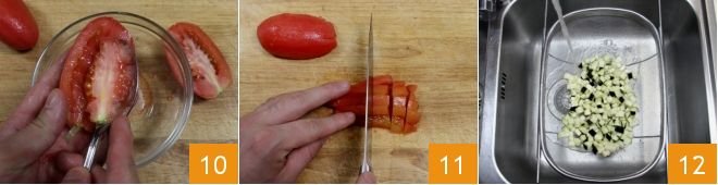 Then cut them in half and also remove the seeds by scooping out the insides with a teaspoon 10, then cut them into cubes 11, and place them in a small bowl. After the necessary minutes, take the eggplants, rinse them quickly under running water 12.