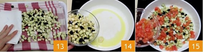 Transfer them to a dry kitchen towel and pat them with kitchen paper 13. In a skillet, sauté the garlic clove with a drizzle of oil, then add the eggplants 14 and the diced tomatoes 15. Sauté everything for 10-15 minutes, stirring occasionally to allow the vegetables to dry. Season with salt and when they are ready, turn off the heat, remove the garlic clove, and let them cool slightly.