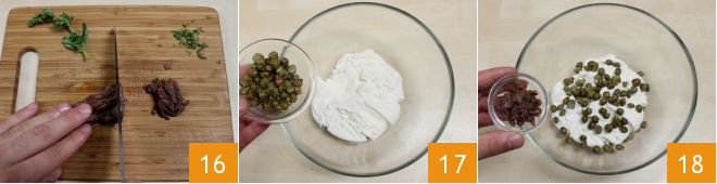 Now proceed to prepare the other ingredients for the filling: chop the fresh oregano and the anchovies drained from the preserving oil 16. In a small bowl, place the ricotta that you have allowed to drain in a fine mesh strainer to lose the whey. Add the capers 17 and the chopped anchovies 18.