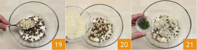 Add also the pine nuts 19, the grated Pecorino cheese 20, and the previously chopped oregano 21.
