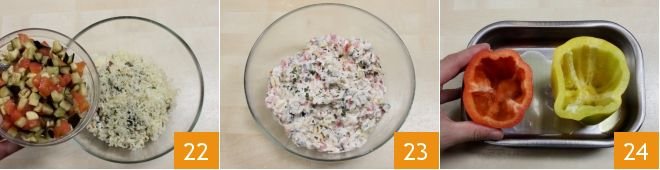 At this point, also add the cubes of eggplants and tomatoes 22 and mix all the ingredients well 23; you can add pepper to your liking. Take a small baking dish so that the peppers are close together, pour a drizzle of oil on the bottom and place the pepper shells in it 24.