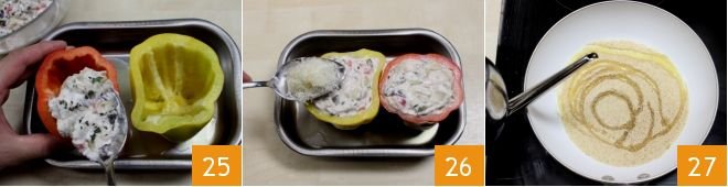 Proceed to fill them with the mixture 25 to the brim. Add a tablespoon of grated cheese to each pepper 26. Meanwhile, in a skillet, toast the breadcrumbs for a few moments with a drizzle of oil 27.