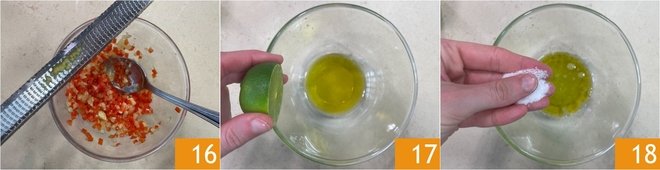 Flavor with grated ginger 16, mix and set aside. For the cucumber marinade, pour oil, lime juice 17, salt, pepper, and sugar into a bowl 18.