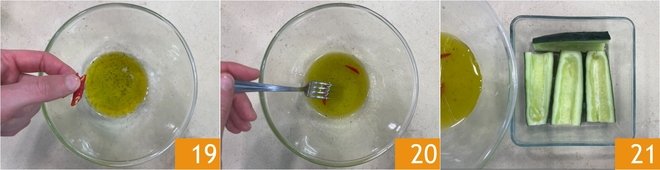 Add a fresh chili pepper 19 and mix 20. Pour everything over the cucumbers 21.