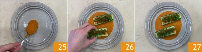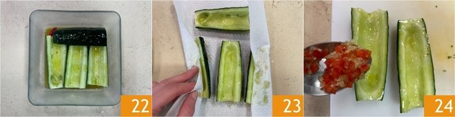 Let marinate in the refrigerator for 30 minutes 22. Once the marinating time has passed, place the cucumbers on absorbent paper and gently pat them dry 23. At this point, fill them with the stuffing 24 and garnish with chopped chives.