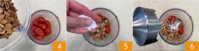 Transfer the cherry tomatoes and peanuts to a jug 4, season with salt 5 and blend with an immersion blender 6.