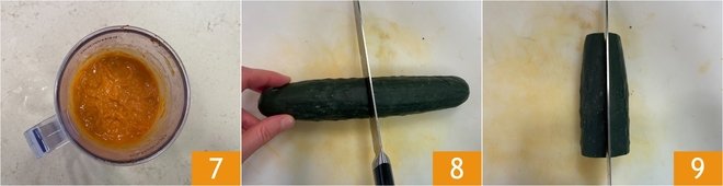 You should obtain a homogeneous sauce 7. Set aside and take care of the cucumbers: remove the ends of the cucumbers and cut them in half 8, then cut them again in half lengthwise 9.