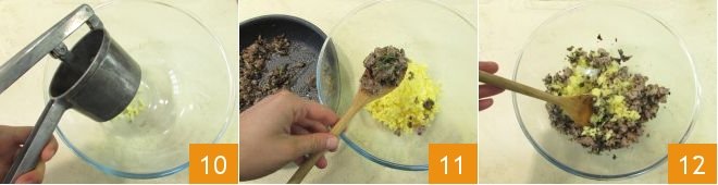 When the potatoes are cooked, mash them in a bowl with a potato masher 10, then add the mushroom and sausage mixture 11, adjust salt if necessary, and mix well 12.