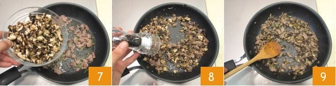 and the chopped mushrooms 7; salt and pepper 8 and cook over medium heat for about 5 minutes, stirring occasionally 9.