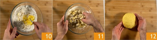 Stir first using a fork 10, and then once the dough has become more consistent 11, transfer it to a pastry board and work it for a few more minutes 12 until it’s nice and even.