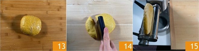 Wrap the dough in plastic wrap 13 and leave it to rest for 30 minutes. Next, take one piece of the dough and flour it lightly with semolina 14. Put it through a pasta machine from the widest to the narrowest thickness; as you put the dough through successive times, you might need to dust it with a little more semolina 15.