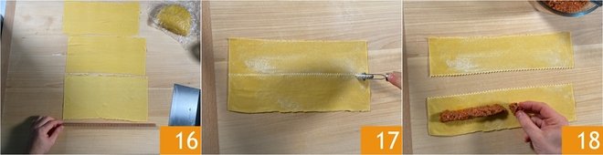 Cut the sheets of dough into rectangles measuring 12x6 inches (30x15 cm) 16. Only make a few at a time, otherwise, they’ll dry out; also make sure to keep the dough you’re not working with always wrapped in the plastic wrap. Next, divide each rectangle in half lengthwise (giving you two rectangles measuring 12x3 inches (30x7.5 cm)) 17 and place the ragu in the middle using your hands, which you will need to have moistened: Create a snake of ragu no thicker than ? inch, being sure to leave a gap of ¾ inch from the edges 18.
