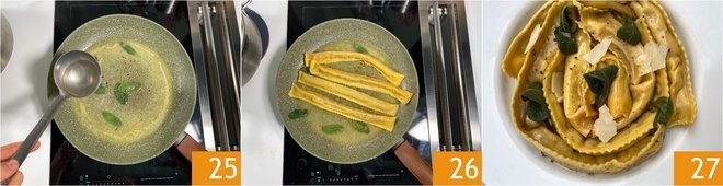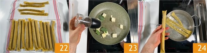 Repeat these steps until you’ve used up all the dough; as your stuffed tagliatelle are ready, arrange them on a tray covered with a dish towel dusted with semolina 22. Once all the stuffed tagliatelle are ready, put a pot full of water salted to taste on the stove, which you’ll use to cook them. Meanwhile, add the butter to a frying pan, season with sage and pepper 23, and let it melt. As soon as the water in the pot is boiling, cook your stuffed tagliatelle for just a few minutes 24.