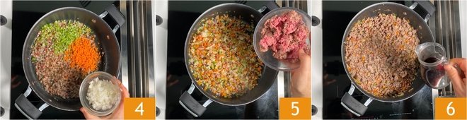 Let it sizzle, and once it’s nicely browned, add the chopped vegetables as well 4. Let them sweat for 5 minutes before adding the ground beef 5to the pot. Give a good stir to break up the meat and let it brown well. Deglaze with the red wine 6.