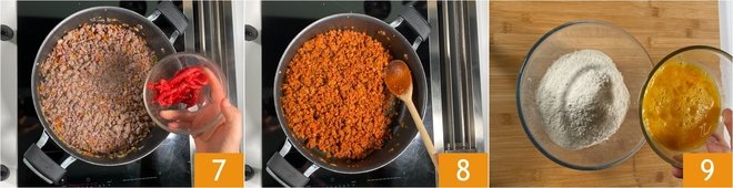Once the alcohol has evaporated, add the tomato paste 7. Add a little water, just enough to dilute the tomato paste, season with salt, and let this cook until the ragu has reduced 8. Leave to cool and then place in the fridge for at least an hour: This is essential to make the filling dense. In the meantime, prepare the egg pasta by pouring the eggs into a bowl with the flour 9.