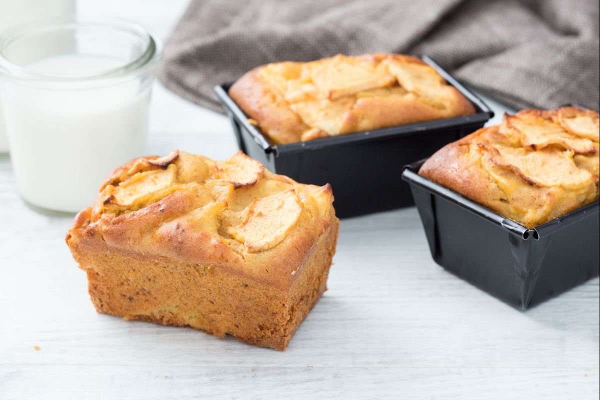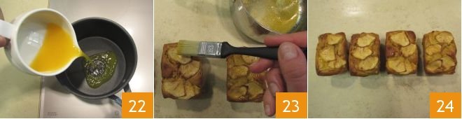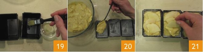 Oil 19 and flour 6 mini loaf molds of 2.75x1.5 inches and 1.75 inches in height, then fill them with the batter up to 0.5 inches from the edge 20. Garnish the surface with the reserved half apple, peeled and sliced 21, and bake in a preheated static oven at 350°F for about 25 minutes.