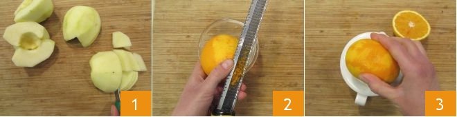 To prepare the sugar-free mini loaf cakes, first wash the apples, then set aside half covered with plastic wrap for the final decoration. Peel and slice the remaining apples into slices about 1/8 inch thick 1 and place them in a large bowl. Grate the zest of an untreated orange and set aside 2; then squeeze the juice from this grated orange and another one 3.