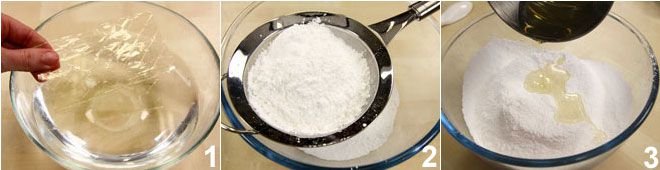 To prepare sugar paste, start by soaking the gelatin in very cold water to soften it 1. Heat the glucose in a thick-bottomed saucepan along with the water, but do not bring it to a boil. Then, squeeze the gelatin and add it to the syrup with the glucose. Sift the powdered sugar into a bowl 2 and add the glucose 3 and glycerin, then knead until the powdered sugar is completely absorbed.