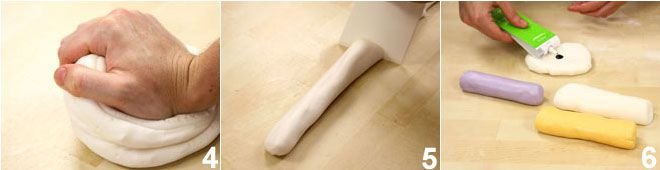 Transfer the mixture to a work surface dusted with powdered sugar and continue to knead until it is smooth and homogeneous 4 and no longer sticks to your hands. If you wish to make colored sugar paste, divide it into small portions 5 and add the desired coloring (preferably gel or paste) 6. Continue kneading vigorously until the coloring is absorbed and the color is uniform. If you want a more intense color, just add more coloring a little at a time. Finally, wrap the sugar paste in plastic wrap and store it in a cool, dry place until you're ready to use it!