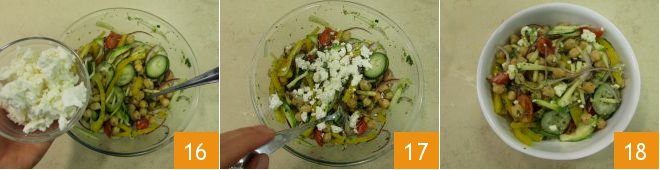 Mix and add the final touch: crumbled feta 16. One last mix 17 and your summer chickpea salad is ready to be enjoyed 18!