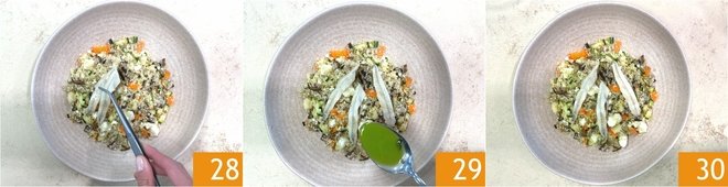 Plate and complete with 3 fillets of anchovies marinated with citrus oil 28 and the mint oil 29. Your summer couscous with marinated anchovies and primosale is ready to be enjoyed 30!