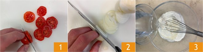 To prepare the summer crunch with tomatoes, first slice the tomatoes 1 and the onion 2 and set aside. Put the flour in a bowl and slowly pour in the water, mixing with a whisk to avoid lumps 3.