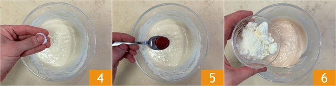 Season with salt 4 and tomato paste 5, then mix again. Next, add the grated pecorino cheese 6.