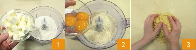 To prepare the summer fruit tart, start with the pastry crust: in a mixer, combine flour, powdered sugar, and butter cut into pieces, chilled from the refrigerator 1 and blend; when you obtain fine crumbs like sand, add the yolks 2. Blending further will form much larger crumbs: at this point, transfer the mixture to a work surface and knead 3 until you get a homogeneous and compact dough.