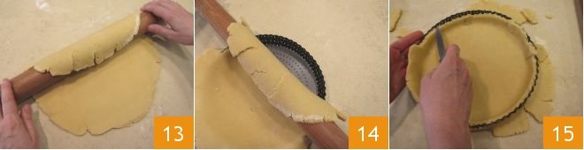 Until you obtain a thickness of about 1/4 inch 13, line a 9.5-inch diameter tart pan 14, then trim the excess dough with a small knife 15 and set it aside as it will be used to form the lattice strips.