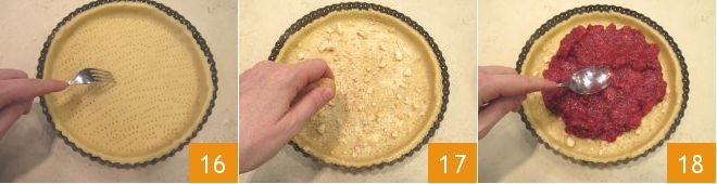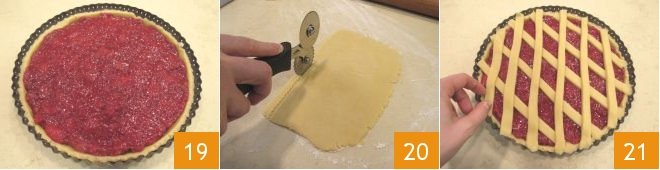 Until covering the entire surface 19. Form strips with the leftover pastry dough 20 and place them in a crisscross pattern on the tart 19, forming a lattice.