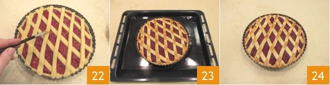 Beat an egg and brush the pastry strips 22, then bake in a preheated static oven at 350°F for about 40 minutes. Let it cool on a wire rack 23 and your summer fruit tart is ready to be served 24!