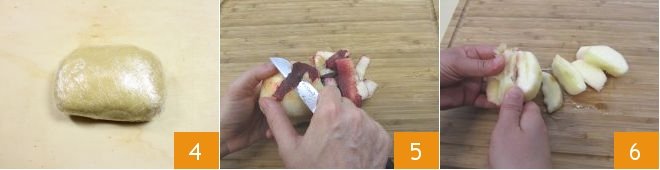 Form a dough ball 4, wrap it in plastic wrap, and refrigerate for at least half an hour. In the meantime, wash and peel the peaches 5, slice them and then cut into pieces 6.