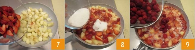 Then add them to a pan along with the hulled strawberries 7. Add the sugar 8 and finally add the raspberries 8.