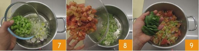 then add the celery, spring onion, and leek 7. Sauté for a couple of minutes, then add the diced tomatoes 8, the basil leaves 9.