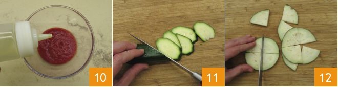 Now prepare the toppings: in a bowl, pour the tomato sauce, season it with oil and salt 10, and mix. Wash the vegetables and then slice the zucchini into rounds 11 and the eggplants into slices 12.