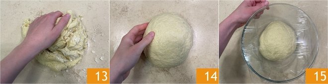 Continue to work on the countertop 13 until you obtain a smooth and homogeneous dough 14. Place the dough in the bowl, cover with plastic wrap, and let it rise for 2-3 hours at room temperature, preferably in the oven with the light on 15.
