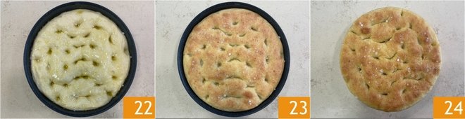 At this point, season the focaccia with plenty of olive oil 19 and press your fingers into the dough to form the classic dimples 20. Finally, sprinkle the surface with coarse salt 21.