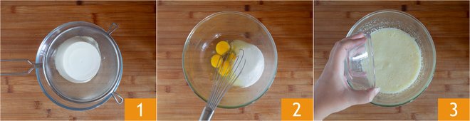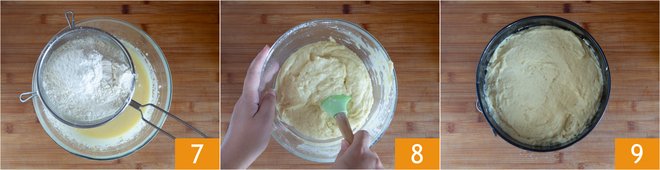 Also add sifted flour and baking powder 7. Mix until you get a smooth batter without lumps 8. Butter and flour an 8.66-inch (22 cm) mold, pour the batter into it, and level the surface with a spatula 9.