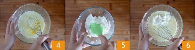 Flavor with the grated zest of an untreated lemon 4. Take the drained ricotta and stir it to soften 5, then incorporate it into the batter 6.