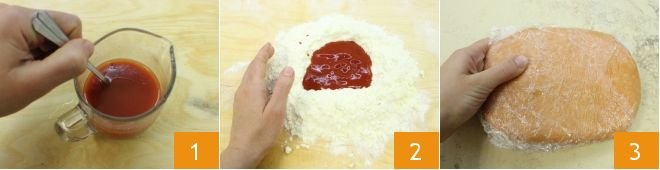 To make the pie pops, start by preparing the red shortcrust pastry following our recipe for Tomato shortcrust pastry: mix the tomato paste in the ice-cold water 1. Proceed with the rubbing-in method: place the sifted flour, cold butter, and a pinch of salt in a mixer and blend until you get a sandy mixture. Place the mixture on a work surface in the classic fountain shape and add the tomato paste diluted in water to the center 2, knead everything quickly until you get a compact dough. Once ready, wrap your shortcrust pastry in a sheet of plastic wrap 3 and let it rest in the fridge for at least 40 minutes.