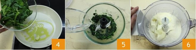 Now focus on the green shortcrust pastry: sauté the spinach with a drizzle of oil and a clove of garlic 4, when they are soft, transfer them to the mixer and blend them with the amount of cold water that should be added to the flour, which is 35 ml 5. Continue by rubbing the flour and butter in a mixer 6,